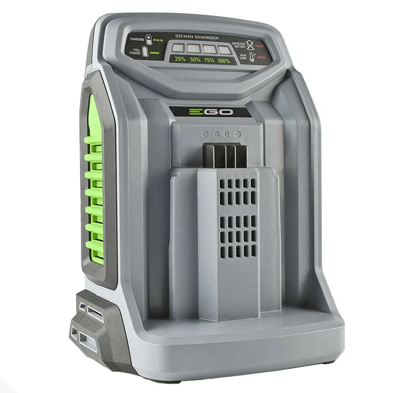 CARGADOR RÁPIDO DE BATERIA CH5500E – EGO. Cuando llega el momento de cargar la batería, el cargador rápido EGO Power+ es sin duda, el más veloz del mercado. De hecho, con el cargador rápido, la batería de 2,5Ah solo tarda 30 minutos en cargarse por completo. FLUJO DE AIRE DE 360° Mantiene la batería fresca para garantizar un tiempo de carga más rápido. El sistema de control inteligente de la batería supervisa constantemente la potencia y la temperatura de cada célula para proporcionar la carga más rápida y eficaz. Esto significa que el tiempo que se tarda en recargar la batería suele ser inferior al tiempo de funcionamiento que se obtiene con una carga completa. Un útil indicador LED de carga/diagnóstico te permitirá conocer el progreso de la carga y el estado de la misma.