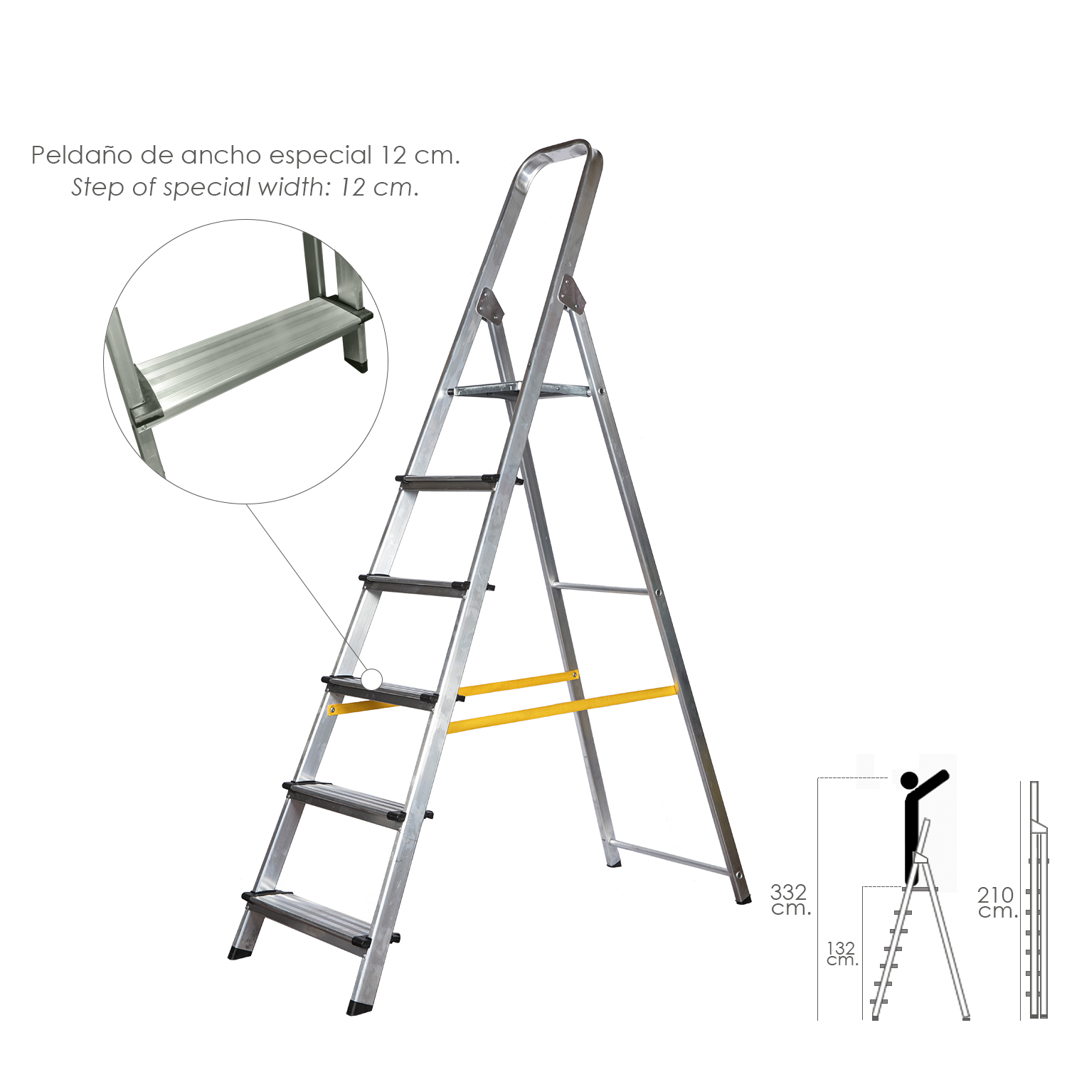 Etiquetas: escalera, escalera 6 peldaños, escalera aluminio, escalera domestica, peldaño 12 cm, peldaño 120 mm, peldaño ancho