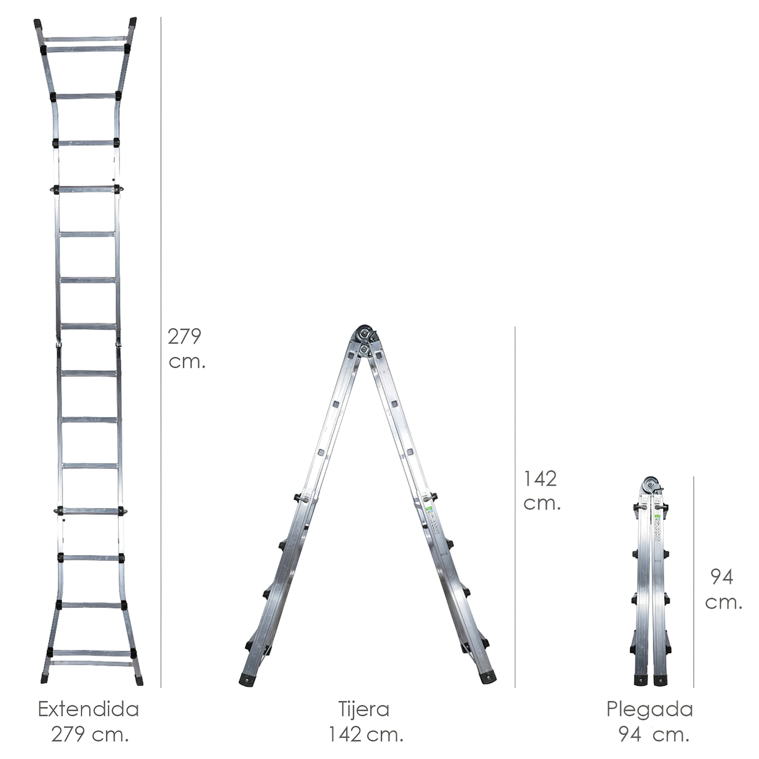 – Altura plegada / tijera / extendida: 94 / 142 / 279 cm.