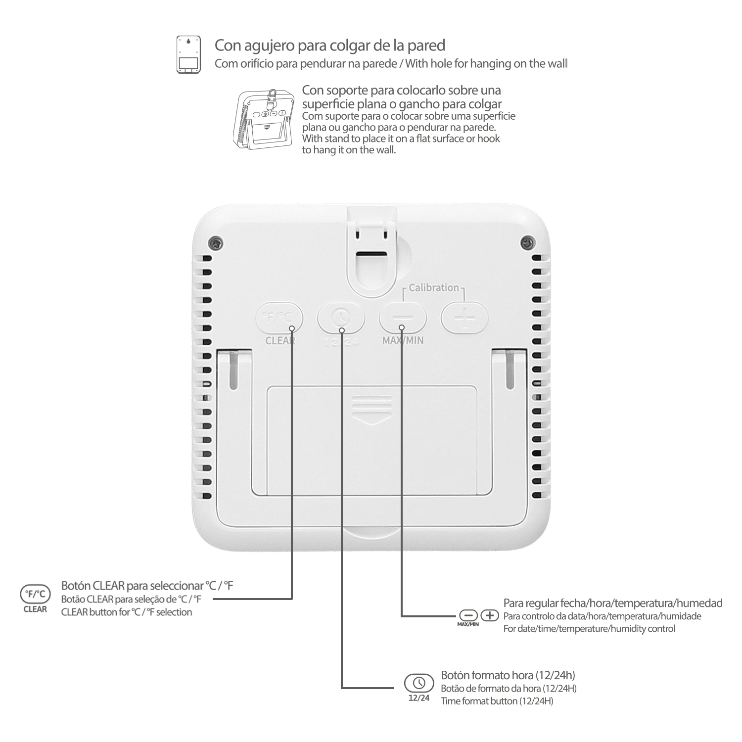 – La estación ofrece un amplio rango de medición de temperatura interior de -10 a 60 ºC (14 a 140 ºF) y de humedad de 10% a 99%, lo que le permitirá tener un control preciso del ambiente en tiempo real. También puede seleccionar la unidad de visualización de temperatura entre ºC y ºF según su conveniencia.