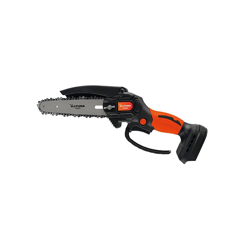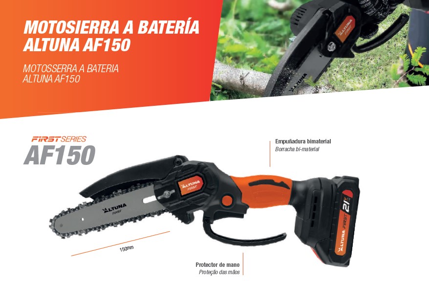MOTOSIERRA A BATERIA AF150 21V 2AH 28MM  ALTUNA. Capacidad de corte 150 mm. Voltaje: 21 V. AMPERAJE: 2,0 Ah. Potencia: 800 W. Velocidad de corte: 10 m/s. Carga: 2 horas. Incluye: motosierra inalámbrica. Incluye maletín de transporte, 2 baterías de litio 21V 2.0AH, cargador USB, 1 cadena de repuesto, gafas de protección, kit de herramientas y guía de uso y mantenimiento.